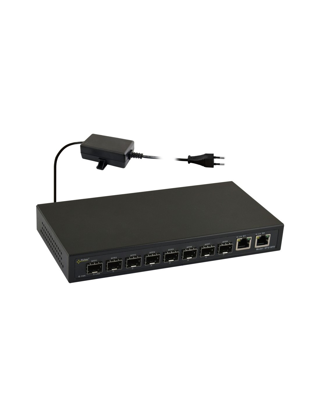 SFG10F8 to 10-portowy switch optyczny przeznaczony do transmisji danych w sieci Ethernet za pomocą przewodów światłowodowych oraz UTP Cat 5e. Switch posiada osiem gniazd SFP (oznaczone SFP1 ÷ SFP8), które po zastosowaniu modułu światłowodowego (wkładka GBIC) umożliwiają transmisję po światłowodzie. Porty G1 i G2 służą do podłączenia kolejnych urządzeń sieciowych poprzez złącze RJ45. Na panelu przednim znajduje się sygnalizacja stanu pracy urządzenia zrealizowana na diodach LED.
