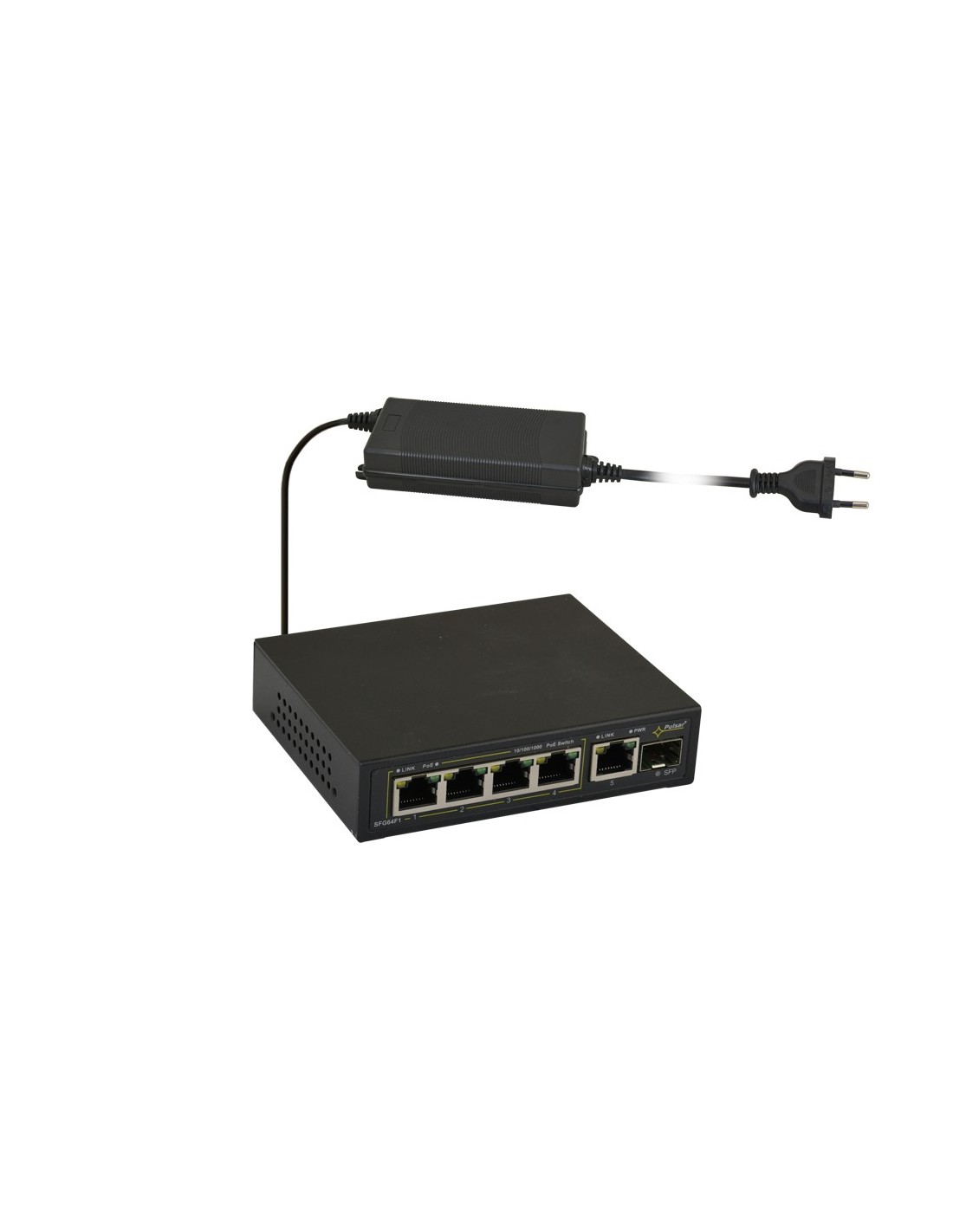 SFG64F1 to 6-portowy switch PoE przeznaczony do zasilania kamer IP pracujących w standardzie IEEE 802.3af/at. Switch na portach od 1 do 4 posiada funkcję automatycznej detekcji urządzeń zasilanych w standardzie PoE/PoE+. Porty UP LINK (oznaczone 5 i SFP) służą do podłączenia kolejnych urządzeń sieciowych (w porcie SFP należy zastosować wkładkę GBIC). Na panelu przednim znajduje się sygnalizacja stanu pracy urządzenia zrealizowana na diodach LED.
