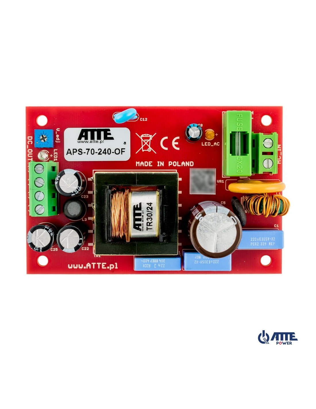 APS-70-240-OF to zasilacz sieciowy dostarczający stabilnego napięcia stałego dla wymagających urządzeń elektronicznych m.in. kamer CCTV, rejestratorów itp. Dzięki integracji zabezpieczeń przeciwprzepięciowych i zwarciowych jest on polecany szczególnie do pracy w systemach monitoringu wymagających wysokiej niezawodności zasilania. Układ zasilacza to wysokosprawna przetwornica impulsowa zapewniająca izolację pomiędzy siecią 230 VAC i zasilanym urządzeniem.