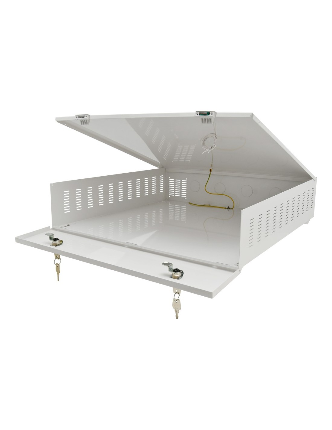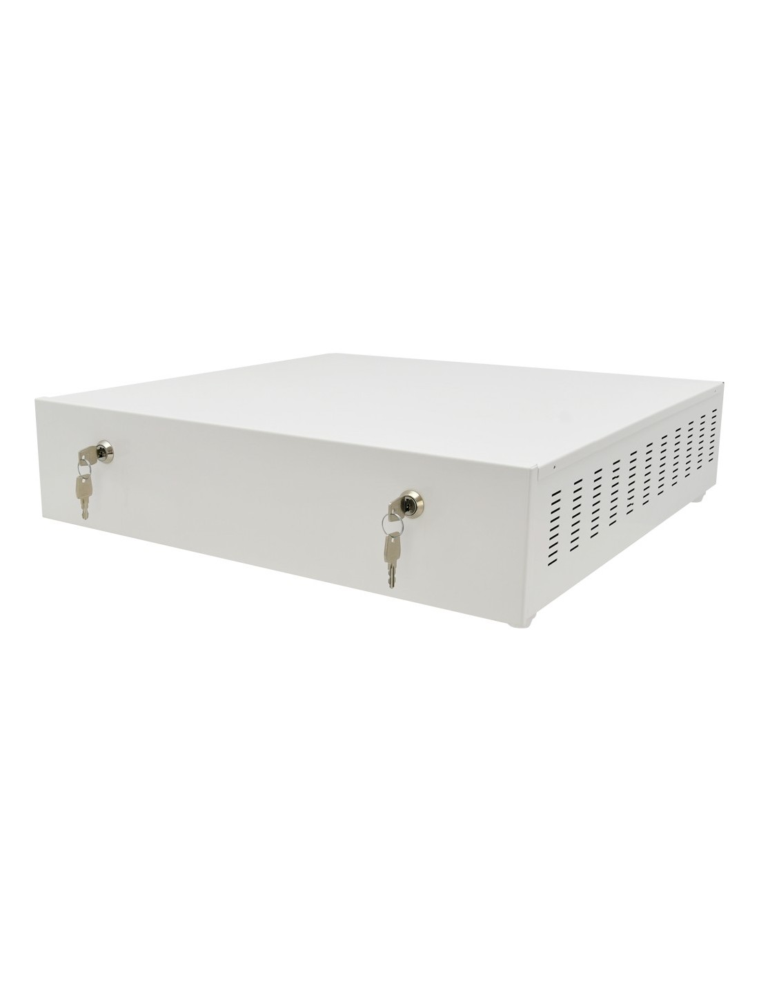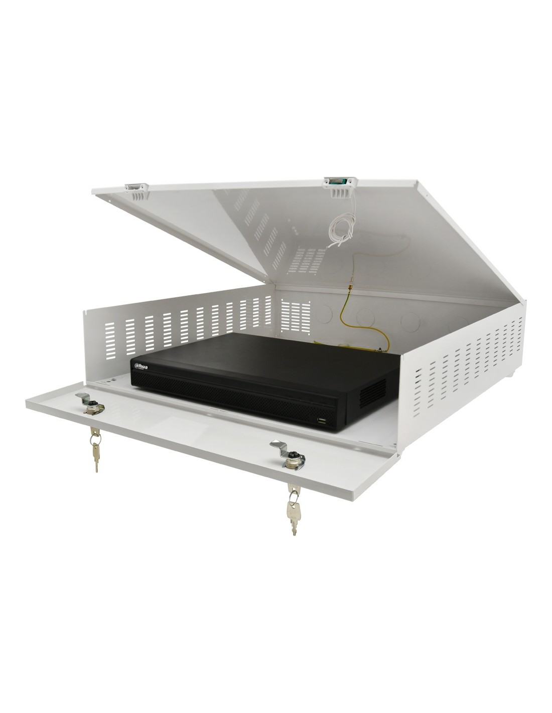Konstrukcja obudowy dostosowana do wymagań z zakresu ochrony danych osobowych (RODO), które muszą być chronione i bezpiecznie przechowywane. Obudowa służy do zabezpieczenia rejestratora przed niepowołanym dostępem lub kradzieżą. Wykonana jest z blachy o grubości 1mm. Na wyposażeniu dwa zamki (różny kod), do każdego zamka dwa klucze w zestawie oraz tamper otwarcia obudowy i oderwania od ściany.