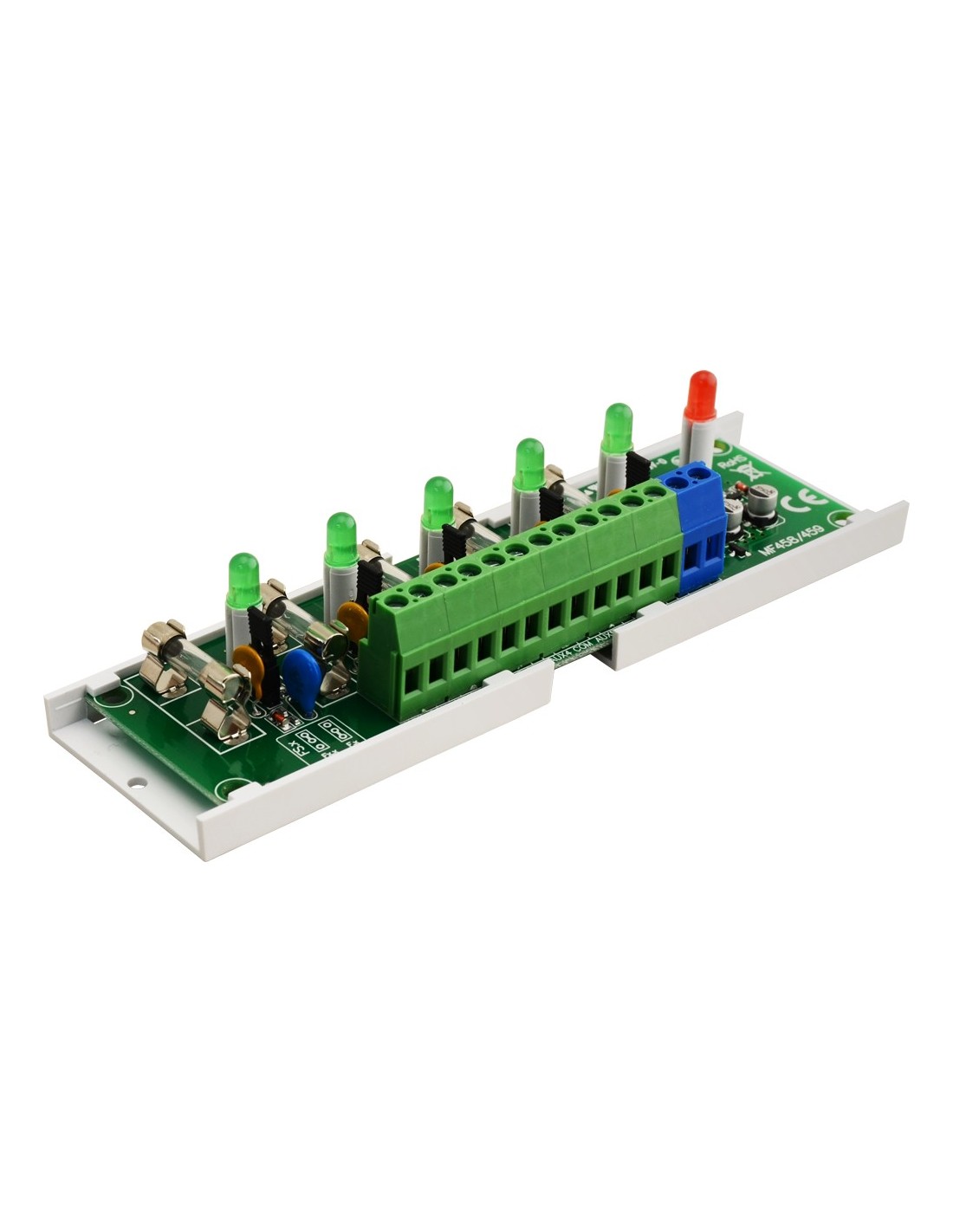 Moduł bezpiecznikowy LB5/5x0,5A/2,5/AW przeznaczony jest do rozdziału zasilania w systemach niskonapięciowych wymagających napięcia z zakresu 10V÷30V DC lub 10V÷24V AC (np. zasilacz buforowy, transformator itp.). Posiada wejście IN do podłączenia zasilania oraz pięć niezależnie zabezpieczonych wyjść zasilania AUX1÷AUX5. Każde wyjście AUX wyposażone jest w zabezpieczenie przeciwzwarciowe (SCP), w postaci bezpiecznika topikowego F 0,5A lub bezpiecznika polimerowego PTC 0,5A (możliwość założenia bezpieczników 1A, brak na wyposażeniu) oraz przepięciowe - warystory. Stan wyjść sygnalizowany jest poprzez pięć diod LED L1÷L5. Uszkodzenie bezpiecznika sygnalizowane jest poprzez zgaszenie odpowiedniej diody LED: L1 dla AUX1, L2 dla AUX2 itd. Dodatkowo w przypadku awarii załączane jest wyjście FPS (stan hi-Z) i dioda LED LFPS. Wyjście FPS może służyć do zdalnej kontroli stanu modułu np. zewnętrzna sygnalizacja optyczna. Moduł jest przystosowany do podłączenia przewodów o maksymalnym przekroju 2,5mm2.