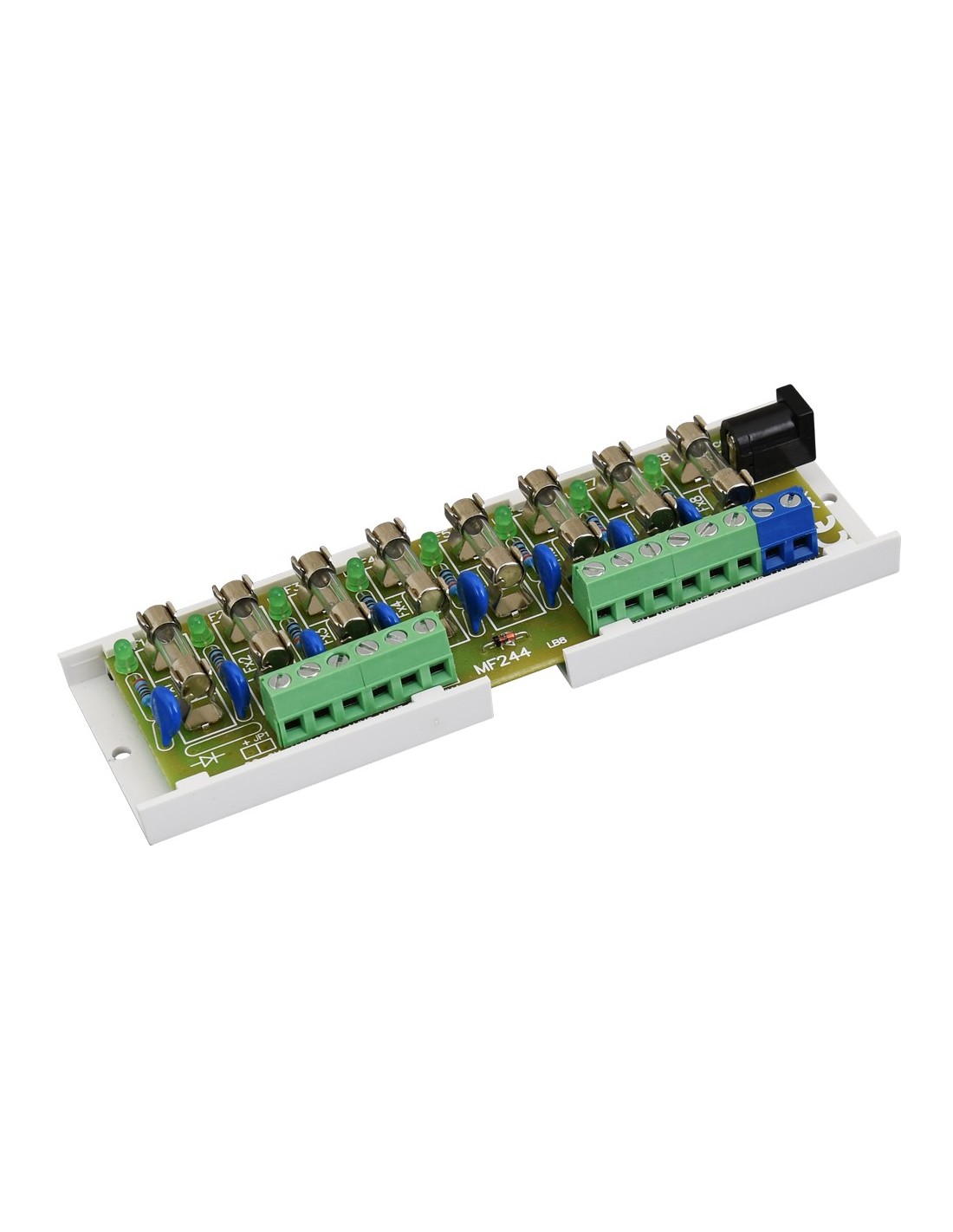 Moduł bezpiecznikowy przeznaczony jest do rozdziału zasilania w systemach alarmowych niskonapięciowych (dystrybucja zasilania) wymagających napięcia z zakresu: 10V÷ 30V DC. Posiada dwa wejścia zasilania: złącze śrubowe i gniazdo DC 5,5/2,1 oraz osiem niezależnie zabezpieczonych bezpiecznikami topikowymi F0,5A (możliwość założenia bezpieczników 0,3A, brak na wyposażeniu) wyjść zasilania AUX1÷AUX8. Zadziałanie bezpiecznika sygnalizowane jest poprzez zgaszenie odpowiedniej diody LED modułu: L1 dla AUX1, L2 dla AUX2 itd. Dodatkowo każde z wyjść zabezpieczone jest warystorem chroniącym zasilacz oraz odbiorniki przed skutkami wystąpienia przepięć w układzie zasilania.