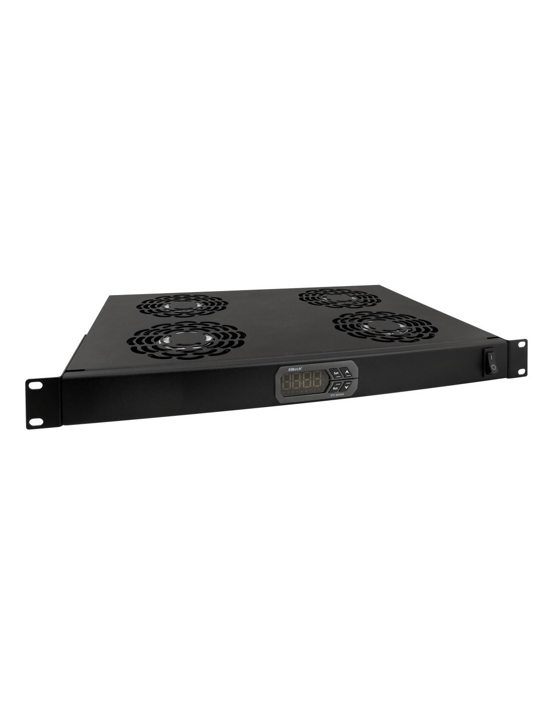 Panel czterech wentylatorów zintegrowany z cyfrowym termostatem w obudowie RACK 19” wysokości 1U. Wymusza obieg powietrza pomiędzy aktywnymi urządzeniami generującymi ciepło wewnątrz szaf RACK. Wyposażony jest w rozłączny czujnik temperatury o długości 2m i rozłączny kabel zasilający 230 V AC o długości 2m.