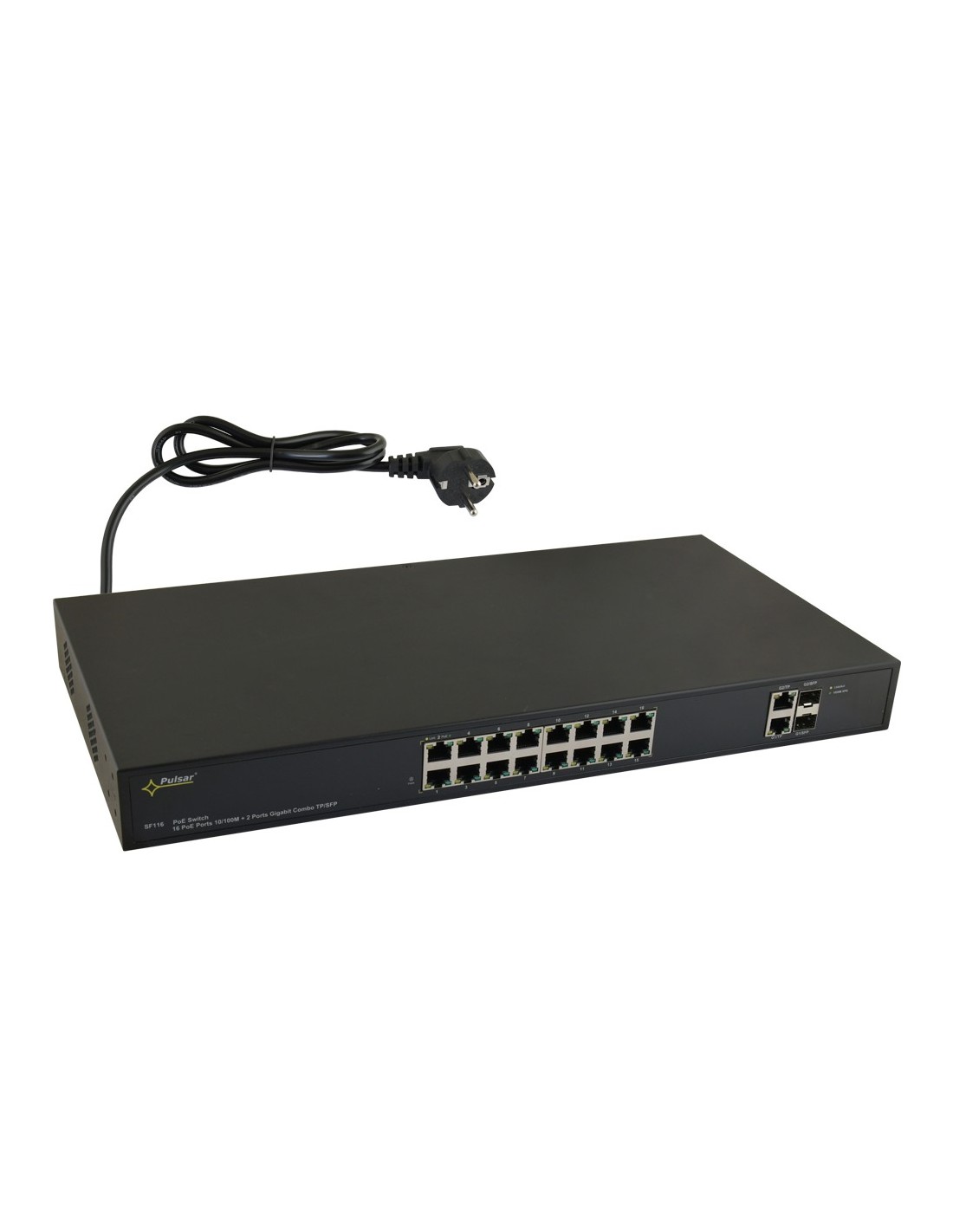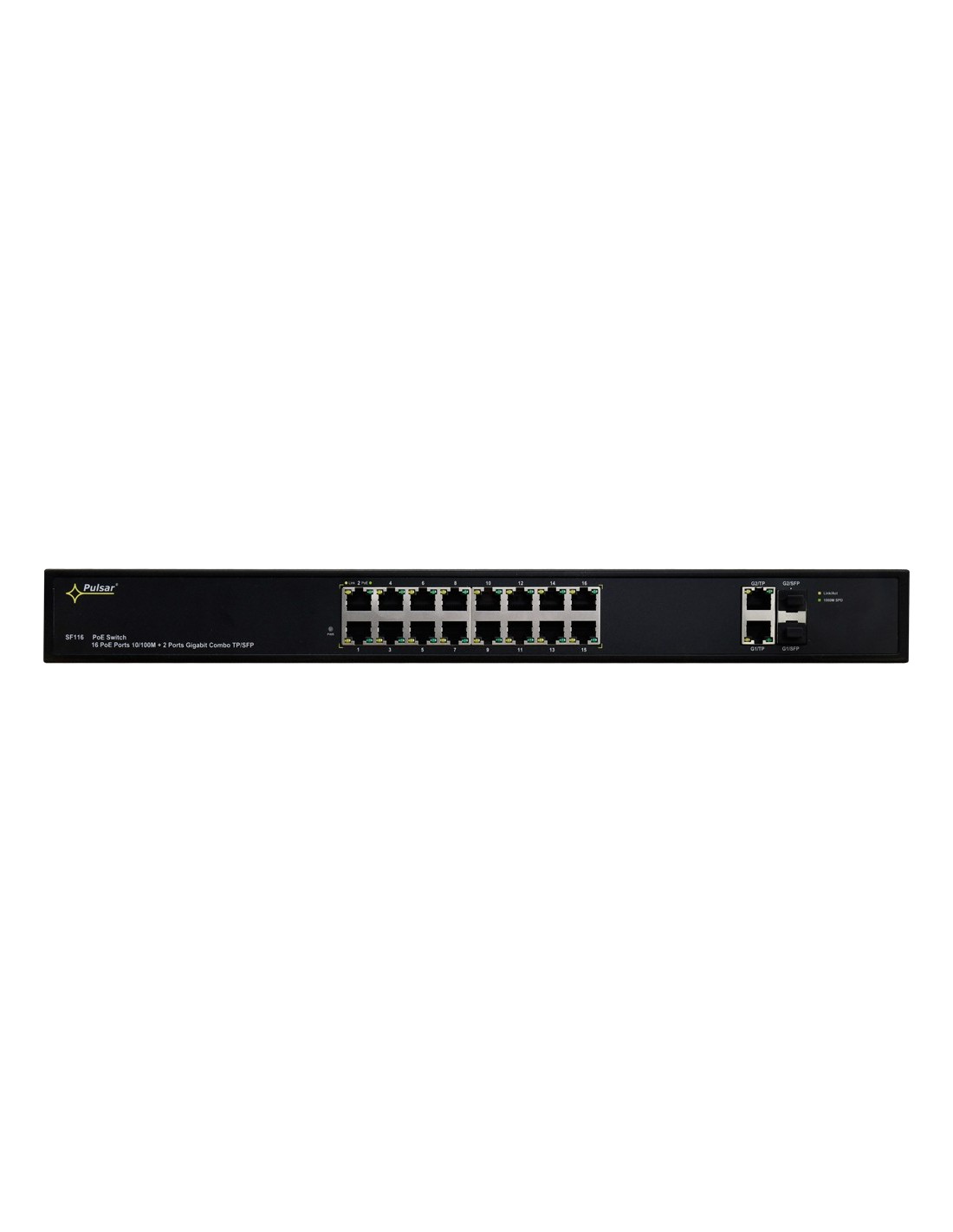 | Przeznaczenie | SF116 to 16-portowy switch PoE przeznaczony do zasilania kamer IP pracujących w standardzie IEEE 802.3af/at. Switch na portach od 1 do 16 posiada funkcję automatycznej detekcji urządzeń zasilanych w standardzie PoE/PoE+. |