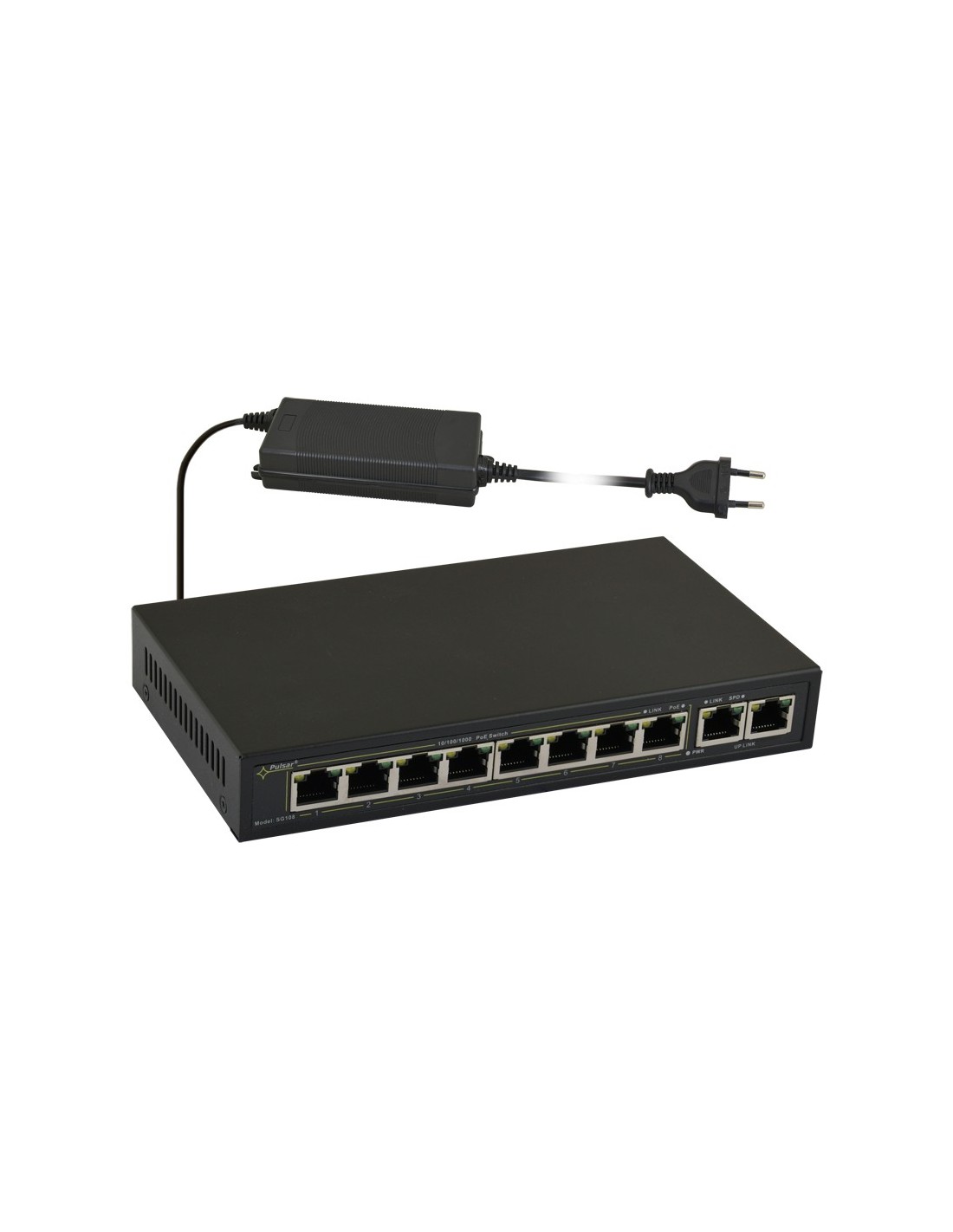 SG108-90W to 10-portowy switch PoE przeznaczony do zasilania kamer IP pracujących w standardzie IEEE 802.3af/at. Switch na portach od 1 do 8 posiada funkcję automatycznej detekcji urządzeń zasilanych w standardzie PoE/PoE+. Porty UP LINK służą do podłączenia kolejnych urządzeń sieciowych poprzez złącze RJ45. Na panelu przednim znajduje się sygnalizacja stanu pracy urządzenia zrealizowana na diodach LED. Technologia PoE zapewnia połączenie sieciowe oraz obniża koszty instalacji, eliminując potrzebę doprowadzania oddzielnego kabla zasilającego do każdego urządzania. Oprócz kamer w ten sposób mogą być zasilane urządzenia sieciowe, które korzystają z tej technologii np. telefon IP, access point, router.