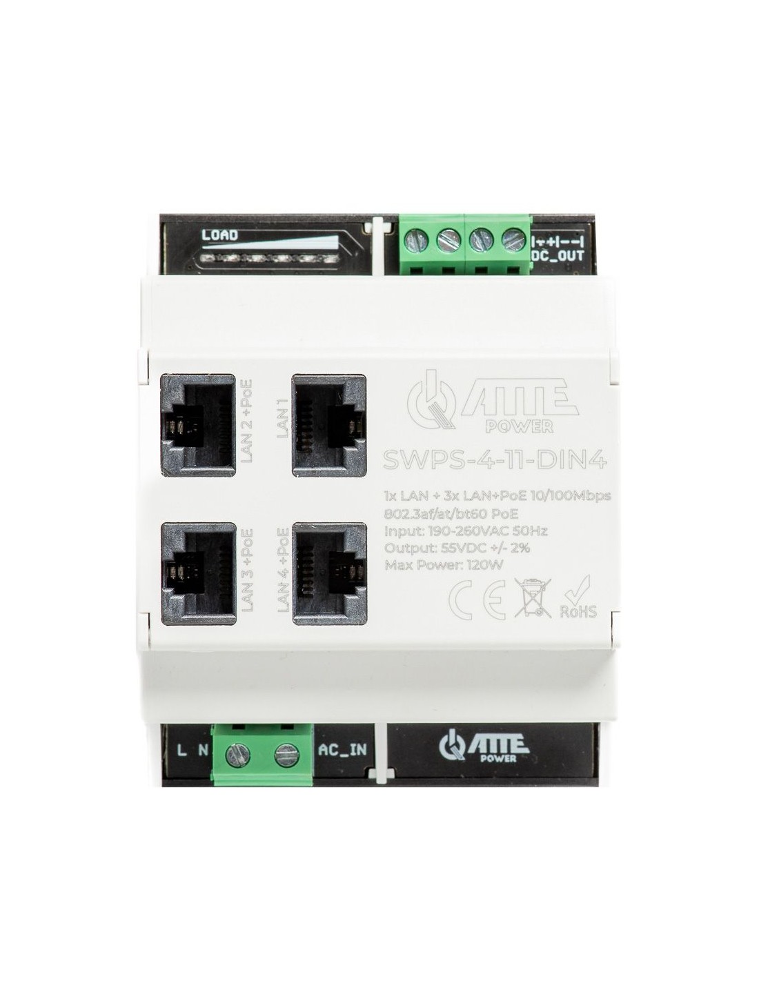 Całkowita moc switcha SWPS-4-11-DIN4 to 120W, jest ona rozdzielana pomiędzy 3 wyjściami PoE oraz dodatkowym wyjściem 55V realizowanym poprzez złącze śrubowe DC_OUT.