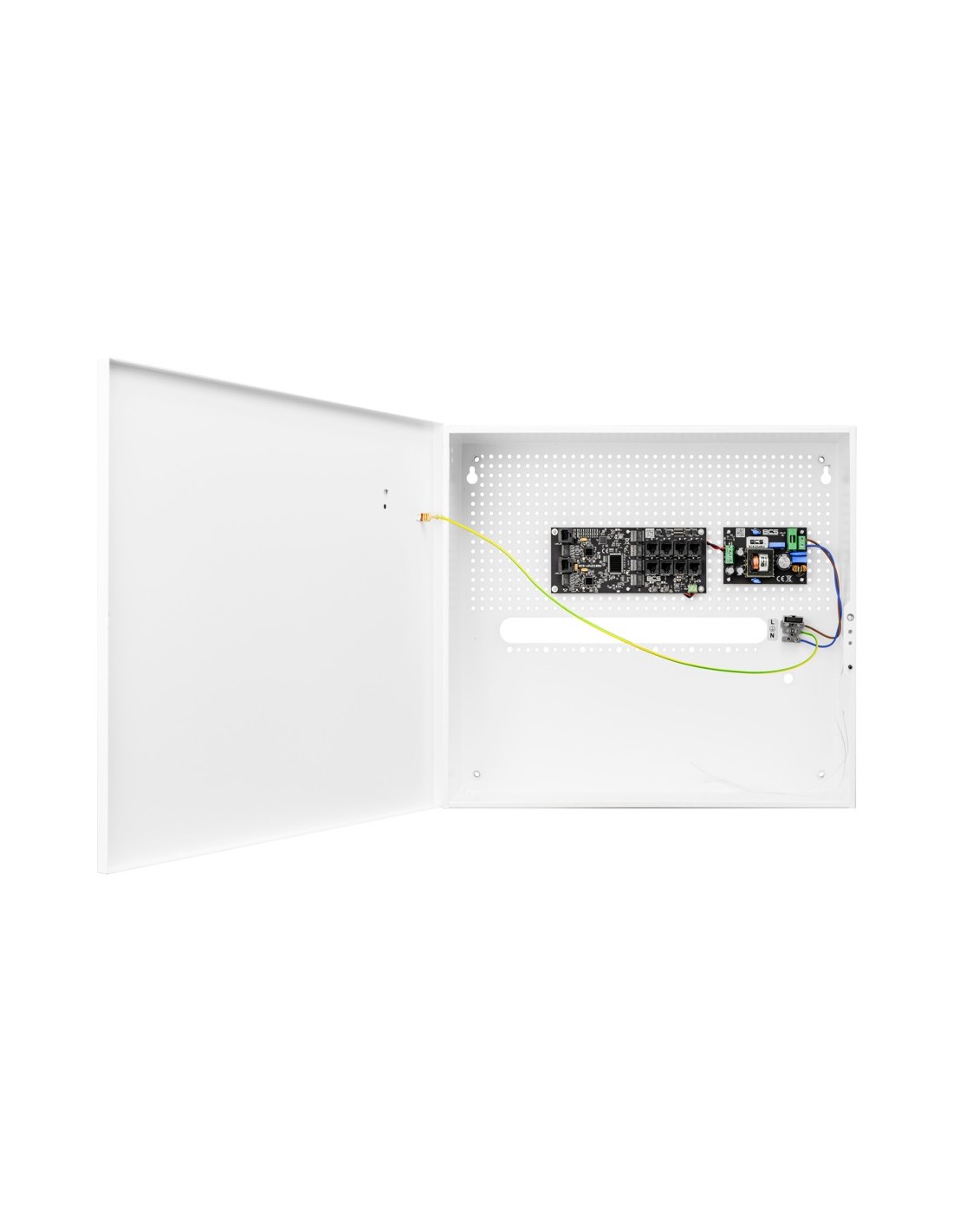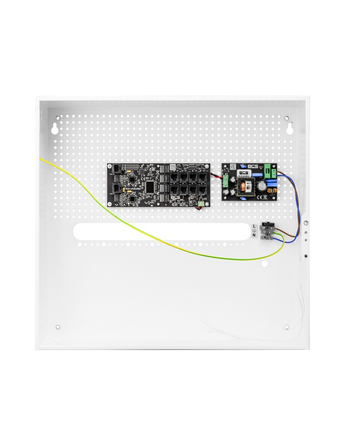 Urządzenie zamknięte jest w obudowie wewnętrznej BCS-H stanowiącej wygodne rozwiązanie problemu estetycznej zabudowy urządzeń monitoringu oraz zakończenia okablowania wewnątrz budynków. Obudowa wykonywana jest z blachy stalowej, lakierowanej proszkowo na półmatowy, biały kolor.