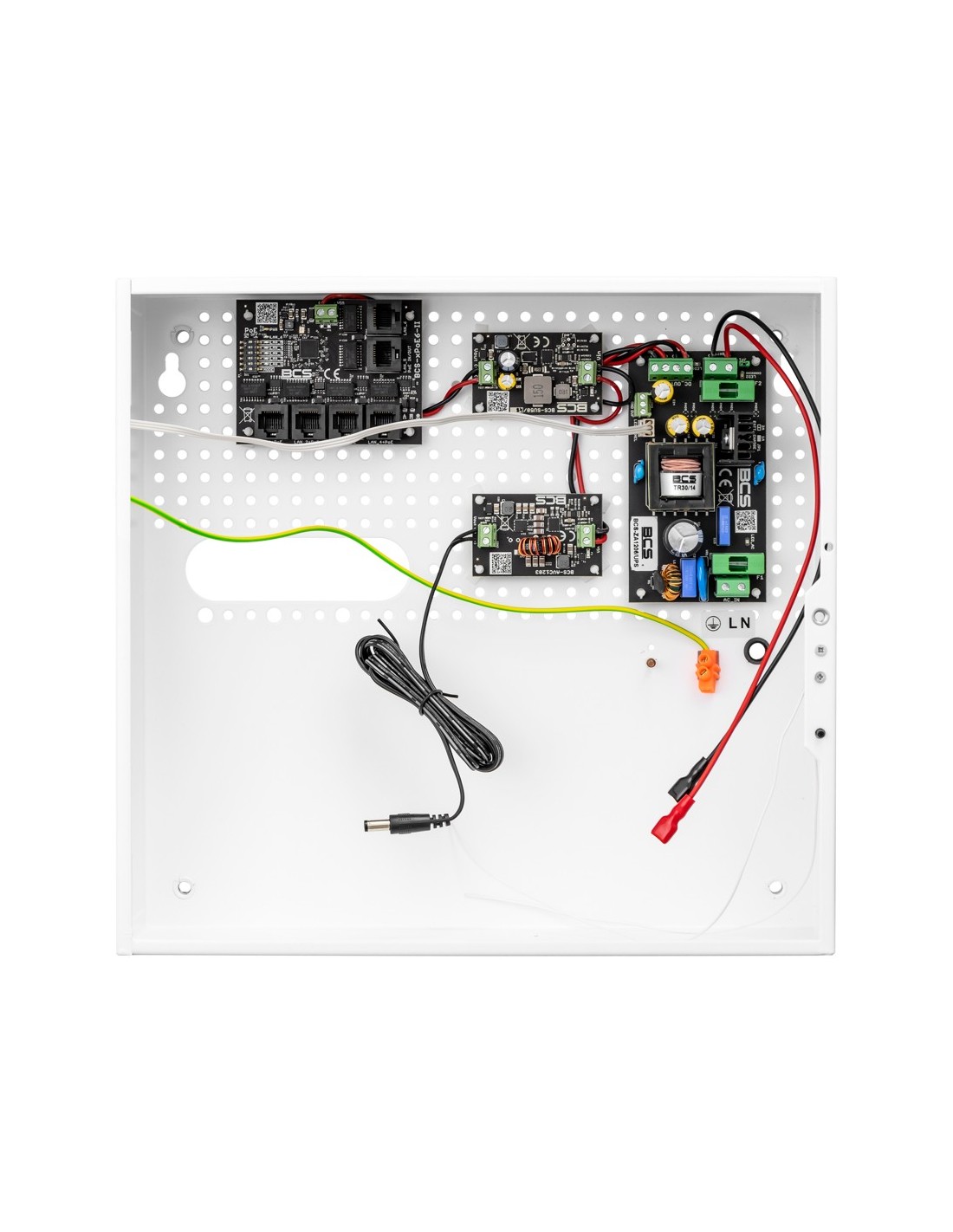 Urządzenie zamknięte jest w obudowie wewnętrznej BCS-F stanowiącej wygodne rozwiązanie problemu estetycznej zabudowy urządzeń monitoringu oraz zakończenia okablowania wewnątrz budynków. Obudowa wykonywana jest z blachy stalowej, lakierowanej proszkowo na półmatowy, biały kolor.