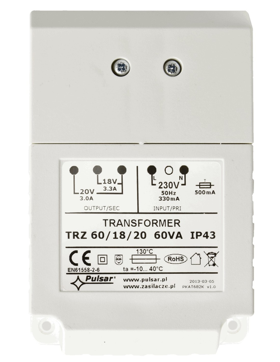 | Transformator | TRZ 60VA - IP 43, tworzywo PC/ABS, zalany żywicą |